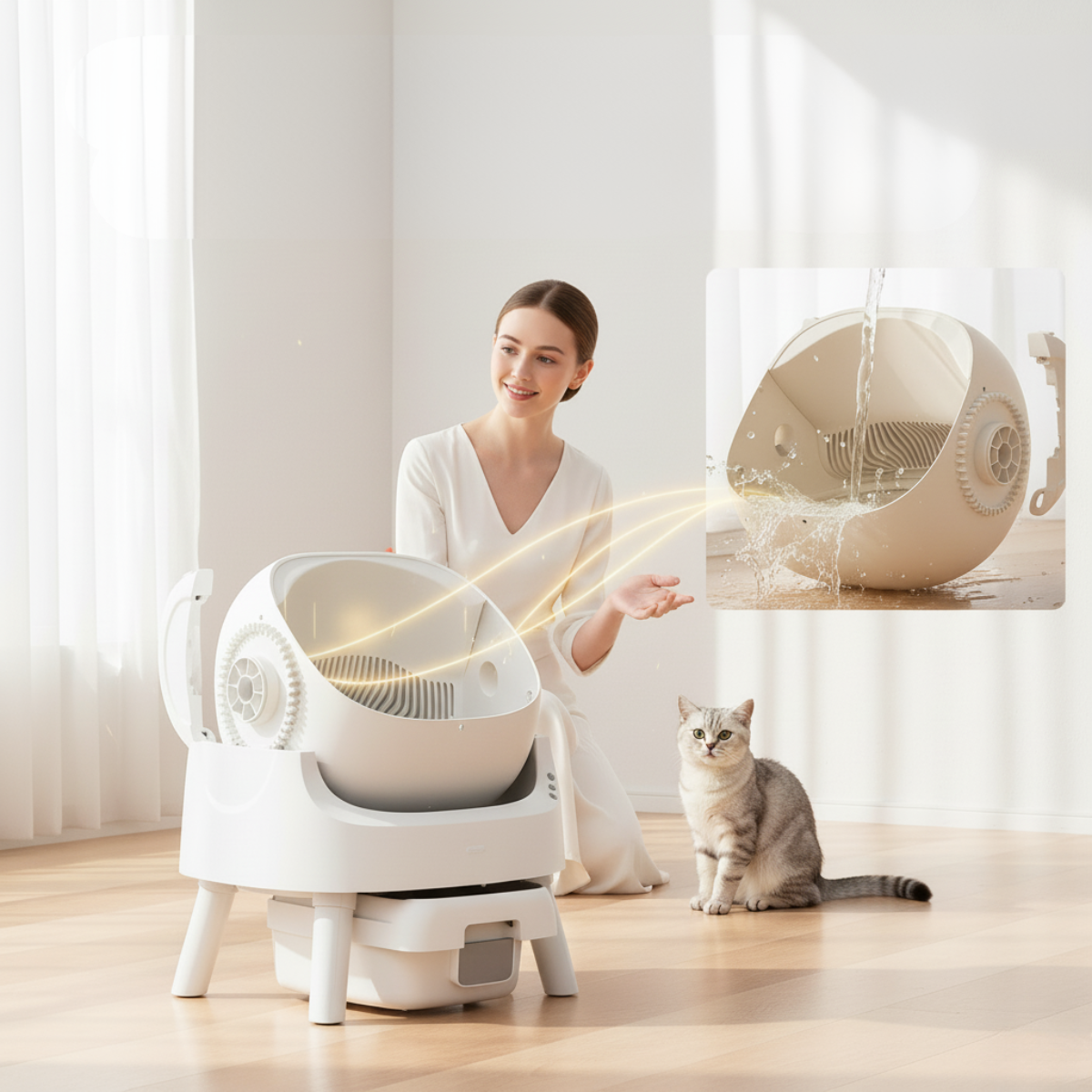 Built with motion sensors and an automatic scooping system, it cleans itself with a single touch.No more manual scooping
